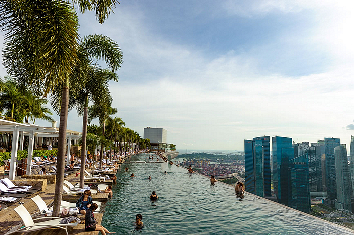 濱海灣金沙酒店以三棟塔樓頂端托著外型像船隻的懸壁平台,55層樓高距離地面200米的無邊際泳池眺望整個濱海灣,其中最著名即是「無邊際泳池」,是許多遊客即使沒有住酒店也要買票上樓在一旁觀看無邊際泳池及登高望遠週邊景致。電影中男主角Nick向女主角Rachel求婚後的派對,就是包下濱海灣金沙的空中餐廳CÉ LA VI,伴隨著煙火狂歡,同時在天台花園的無邊際泳池上演一幕精彩的水中芭蕾表演。