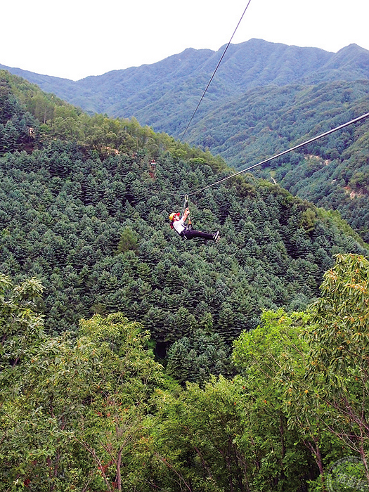 高空飛索是在山峰的高處架設平台,然後平台與平台之間以鋼索相連,人們穿戴好安全防護裝備,在專業教練的解說與輔助下,藉著鋼索翱翔在山與山之間。除了自身的膽量外,隊友們的加油打氣聲是最佳定心丸。加平的高空飛索共分8段,長度與難度隨之遞增,其中包括一段吊橋漫步;體重較重的人,可能因為重力加速度而加快滑行的速度,刺激指數提升,而體重太輕的人,也可能重力加速度不夠而卡在半空中,但是只要遵循教練的訣竅提醒,通常都能有驚無險。