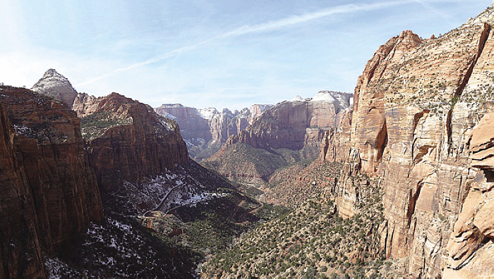 如果說布萊斯峽谷是女王的花園,那麼錫安國家公園就是帝王的聖殿。歷經1,300萬年河流的沖刷與侵蝕,兩岸岩壁拔地而起兩千呎,傲然聳立於天地之間,各式各樣的野花、毬果、仙人掌隨處可見,經遊客中心別忘了與錫安的標誌—聖山合影留戀。而Zion是希伯來語,意味神聖的安祥之地;設立於1928年的錫安國家公園,有上帝之城的美名。公園面向巨大的棋盤山,彷彿天地對奕的殘局猶在。