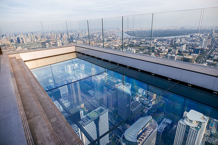 整座Mahanakhon摩天大廈中,最受矚目即是位於大廈中,第74、75和78層的觀景台,這裡設置了世界上最大的玻璃地板和泰國最高的天台酒吧。遊客可以走出透明設計的玻璃地板,直望腳下即可以360度極致景觀欣賞「天使之城」的曼谷。