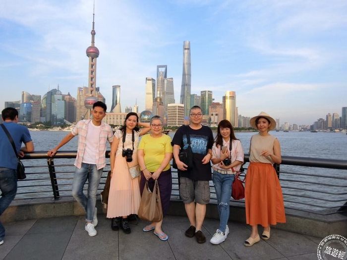 (左起)明星旅遊作家Eric、旅遊作家/《旅奇週刊》總編輯水靜葳、權威美食家胡天蘭、美食達人部落客徐天麟、旅遊部落客傑菲亞娃、女神主播芳瑜於上海外灘景觀前合影,都市容貌一覽無遺。。(圖片提供/曾瀞葳)
