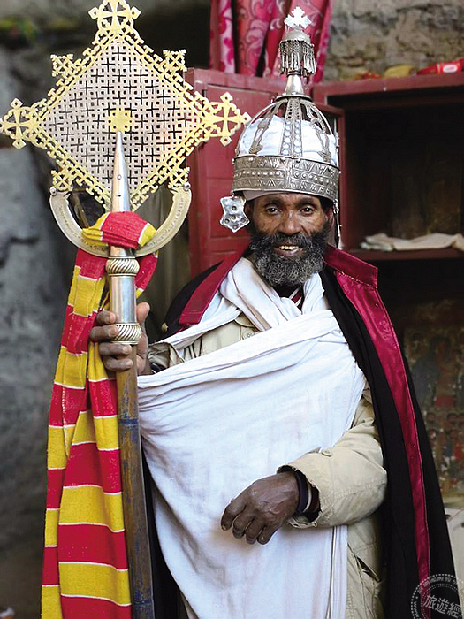 ▲拉利貝拉岩洞教堂的看守人手持十字架等各種法器向旅客講解教堂歷史與文化。