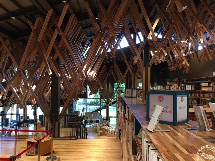 《雲之上圖書館》為2018年完工的最新作,外觀不改融入周邊環境的中心概念,內觀則大量使用町產杉,天花板交錯的木條彷彿進入森林般。開館時間:10:00~21:00;休館日:每週二、每個月最後一個星期五。