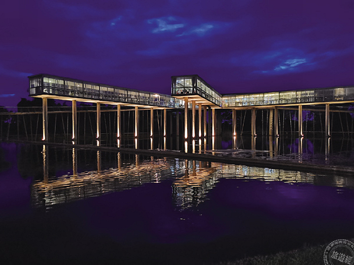 三道長條型的水泥建築,高架在水面上,遠看像是科技版的高腳屋,也像是八爪章魚和蜘蛛的綜合體,所以餐廳乾脆命名為章魚蜘蛛〈Octospider Restaurant〉。這個餐廳不只外觀炫目,餐飲也頗具水準,例如一款加了九層塔的鳳梨汁,聽起來有些詭異,喝起來卻挺順口,特殊的風味令人回味再三。