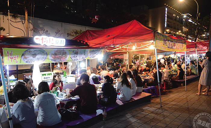 鍾浦海洋公園設有17個紅色大排檔排列成行,喜愛美食的旅人,在此可見麗水地區的美食和新鮮海鮮做成的料理。
