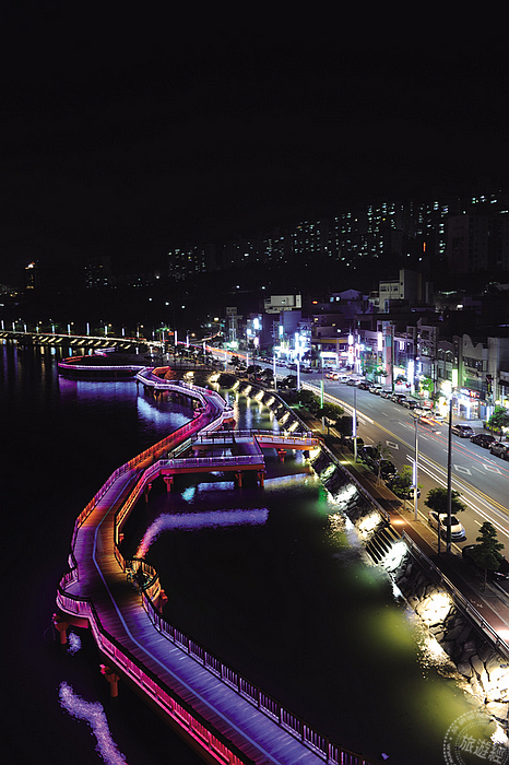 在沿著海岸彎曲延伸的木棧道上,一邊緩步散步,一邊迎來海風享受悠閒時間,尤其是形形色色的璀璨燈光,映襯出連結大海和城區的留白之美。