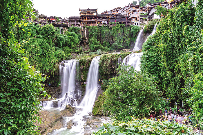 芙蓉鎮本名王村,是擁有兩千多年歷史的古鎮,因電影《芙蓉鎮》在此拍攝聲名大噪而更名,因宏偉瀑布穿流而過,又有「掛在瀑布上的千年古鎮」美名。此地為湘西土司王朝的舊府,故名王村,境內土司行宮可遙想當年盛況。