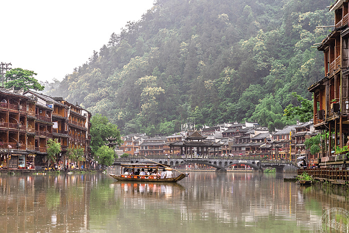 建於明清時期,已有三四百年歷史,被譽為中國最美麗的小城,與雲南麗江古城、山西平遙古城互相媲美。古城以漆黑飛簷的徽派建築與土家族臨江而建的吊腳樓著稱,漫步城內青石板街道,探訪虹橋、楊家祠堂、沈從文故居、萬壽宮等等景點,山光水色、吊腳古樓,令人發思古之幽情。