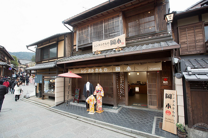 在京都到處可見大大小小的和服租借店,但規模最大的龍頭仍是岡本和服租借店,目前共有7家店舖,包含清水寺附近的總店、清水寺參道沿途的清水寺店,八阪塔的八阪塔前店,祇園店、八阪神社店等,每一家店都設置於京都的觀光區,對於遊客來說相當便利。