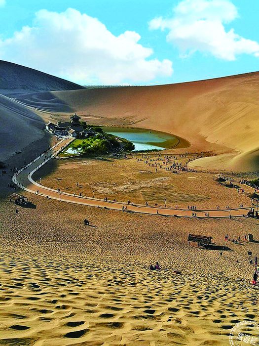 到了敦煌,鳴沙山月牙泉絕對是旅人們必去的經典名勝之地,月牙泉被鳴沙山環抱其中,外型酷似一彎新月因而得名,鳴沙山主要為流沙積成,分紅、黃、綠、白、黑五色,這裡最奇特的景觀莫過於可以看到沙與水共存一處、甚為壯觀,因此成為了世界旅人們嚮往的蒼穹聖地。