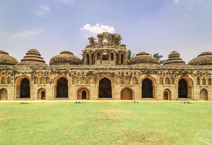 蓮花宮Lotus Mahal揉合印度教和伊斯蘭教的建築風格,1樓打造成開放式的涼亭,樓上則是露台區,整棟建築匯集匠心獨具的精巧雕刻,幾何式排列的拱形門廊,當陽光灑落拱門內,猶如一朵美麗盛開的蓮花。而不遠處的象營Elephant Stables是古帝國時期尊貴皇室的大象居住地,草地上一長列以石頭堆砌的建築,設有11個圓頂房間,其中一間為音樂家的表演廳,可見當時大象受到的尊榮待遇。