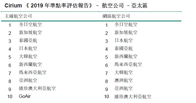 亞太區的航空公司擊敗了許多主要全球航空公司,在全球十大最準時的主線航空公司組別中佔有三席,除全日空航空位居第二之外,還有位居第五的日本航空(Japan Airlines,JAL)和排名九的大韓航空(Korean Air)。