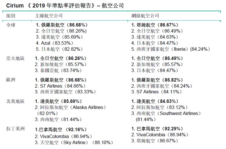 搭乘飛機最擔心取消班機,同樣也不喜歡誤點,根據Cirium長期分析,所發布20019《年度準點率評審報告》中,評選出在2019年航班準時營運方面全球表現最佳的航空公司和機場,至今已連續11年發布其年度排名榜。相關資料顯示,俄羅斯航空(Aeroflot)被評選為全球最準時的主線航空公司和最準時的歐洲航空公司;全日空航空(All Nippon Airways,ANA)在全球最準時主線航空公司和網絡航空公司兩個組別均排名第二,但為亞太地區位居第一;全球網絡航空公司組別排名第一為「拉塔姆航空」(LATAM Airlines);全球最準時的低成本航空公司為日本「星悅航空」(StarFlyer)。另外,全球最準時的機場是莫斯科的「謝列梅捷沃國際機場」(Sheremetyevo International Airport),雖然台灣的航空公司未入榜,但台灣機場有入榜單,高雄國際機場分列在中型機場組別排名第一!