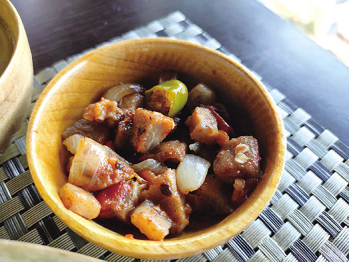 ▲山邦中經典普遍的燻豬肉料理,以多種香料佐豬肉,是一道簡單又美味的料理。