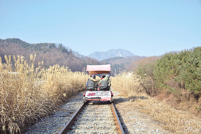 江村鐵道自行車是行駛在滿載回憶的京春線鐵軌上,全長8.5公里,可以在騎行的同時欣賞江原道春夏秋冬的不同風情,還將經過隧道山洞,聽到播放k-pop歌曲搭配絢爛燈效,十分特別。