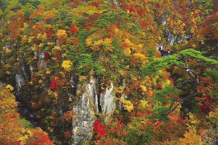 鳴子峽為深達100公尺的V字峽谷,綿延約2.5公里的斷崖山壁兩側奇岩怪石林立,秋季期間滿山滿谷的紅葉美景相當迷人,推薦從大深澤橋遠眺,或漫步峽谷沿岸的鳴子峽步道、大深澤步道與中山平步道,距離「鳴子溫泉鄉」車程僅需10分鐘,非常適合兼享紅葉及溫泉。