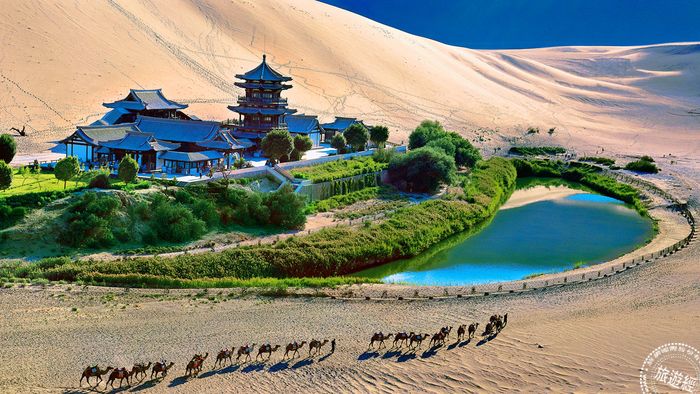 鳴沙山-月牙泉風景區的水池與沙漠並存景色相當罕見。(圖片提供/海旅會官網)