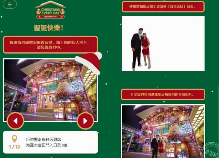 每年聖誕節,海港城為增添節日氣氛都會以不同主題打造大型的聖誕裝飾及舉辦一系列活動,今年除了「巨型聖誕熊仔玩具店」、「聖誕燈飾花園」及「聖誕營火會」等華麗繽紛的打卡點外,海外朋友除了可以在網上欣賞聖誕布置外,還可以在「實景節日佈置虛擬打卡」,將自己或摯愛好友的照片貼到背景上,並分享到社交網站。相關活動網站(http://xmas.harbourcity.com.hk/)查詢及操作!