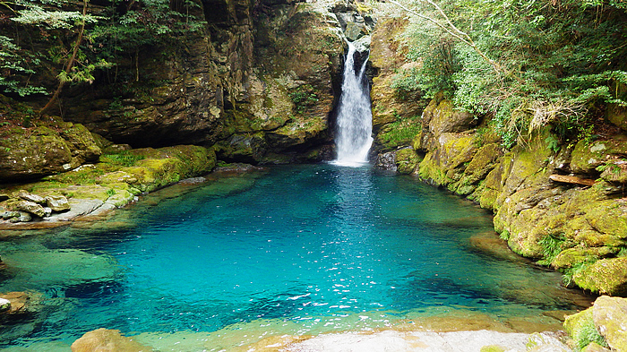 連續6年獲選日本最佳水質河川的「仁淀川」,全長 124 公里,因河水受陽光照射時呈現耀眼迷幻的寶石藍,當地愛稱「仁淀藍」。位於仁淀川上游處的「Niko淵」是一座瀑布潭,被岩石與林木環繞,瀑布流洩而下,陽光灑落在藍綠色相間的水面上,如寶石般耀眼。欣賞美麗仁淀藍的推薦景點還有「中津溪谷」和「安居溪谷」。「中津溪谷」有為熱愛親水人士所打造的步道,讓旅人沿著步道漫遊在奇岩巨石、瀑布、植物等多變的奇景中,能欣賞清澈、神秘的水景,路途中可見幸運七福神石像,增添朝聖的儀式感。而「安居溪谷」的「水晶淵」有仁淀藍代表之稱,險峻的峽谷地貌造就不少瀑布清流,是可以細細品味最輕透仁淀藍的絕景之地,和中津溪谷同為縣內賞楓名所。