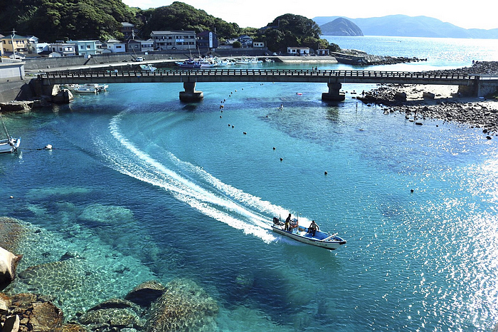 「柏島」是位在高知縣西南大月町的小島,也是四面環海的漁村。因有黑潮經過,賦予溫暖的海水,適合魚類、螃蟹、海龜、珊瑚礁等動物生存。柏島海水時而呈現翡翠藍,時而似鈷藍色,連接純白沙灘帶來的異國感,是旅人心之所向的度假天堂。船隻彷彿浮在水面的景觀像極了義大利國境之南蘭佩杜薩島,足以形容海水的清澈感。此外豐後水道海洋生態豐富,是浮潛勝地。柏島宛如小而精美的海上珠寶盒,蘊藏珍貴的海洋寶藏。