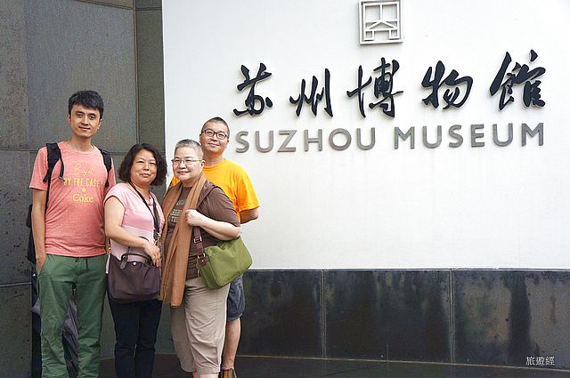 權威美食家胡天蘭、美食達人徐天麟、文青旅遊作家藍白拖與此趟最稱職的導遊小張在蘇州博物館前合影。(圖片提供╱李麗文)