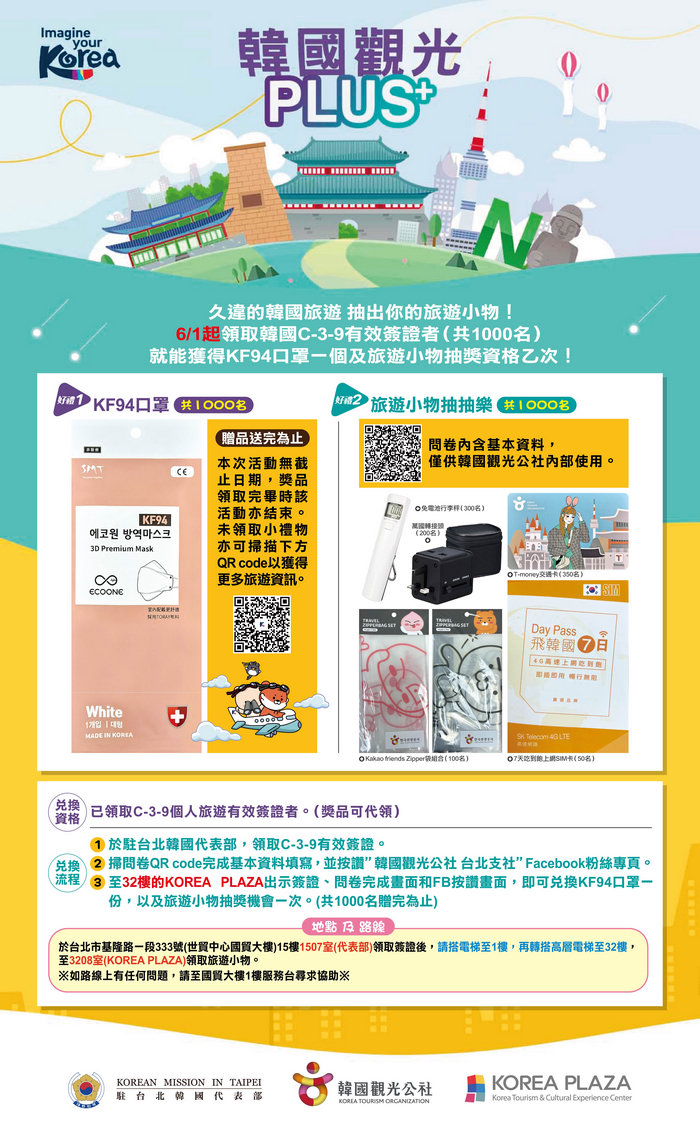 另外,若您至駐台北韓國代表部(台北世貿中心國貿大樓15樓)領取訪韓觀光簽證的民眾,在領完簽證後,到同一樓的32樓前往韓國觀光公社KOREA PLAZA,亦能夠透過人人皆有獎的抽獎活動,抽出屬於您的旅遊小物!獎品包含韓國七日網路吃到飽的SIM卡、萬能轉接頭、環保免電池行李秤、韓國T-MONEY卡及KAKAO FRIENDS旅行夾鏈袋,活動限領取前1,000位領簽民眾!