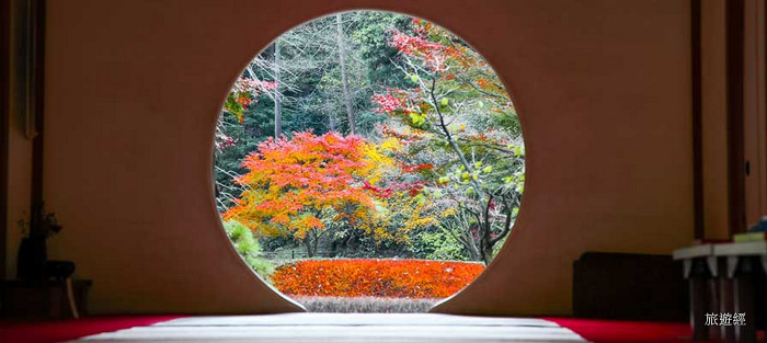 院內最著名的滿月圓窗可欣賞到秋季美麗的紅葉