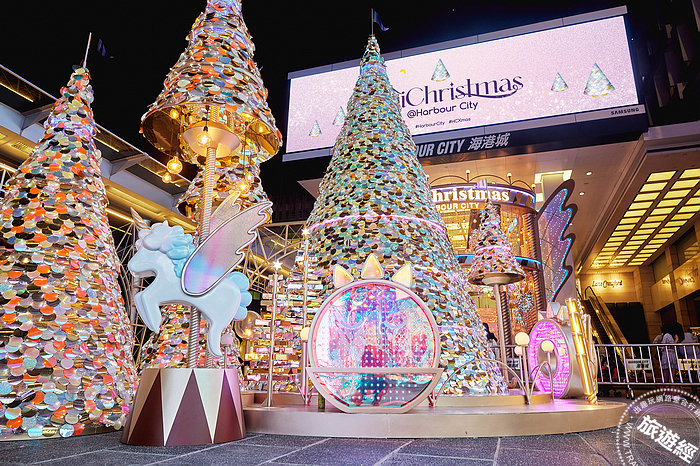 大型商場海港城今年打造「旋轉獨角獸樂園」,帶領大家進入夢幻世界,遊客漫步於海運大廈露天廣場,將被兩旁擺放數十棵大大小小和吊掛在空中的幻彩閃亮聖誕樹包圍著。樂園中的「獨角獸Merry-Go-Round」宮殿位於商場入口,整個天花佈滿數百棵有如天上星星一般的閃燈,絕對是最佳打卡位置!
