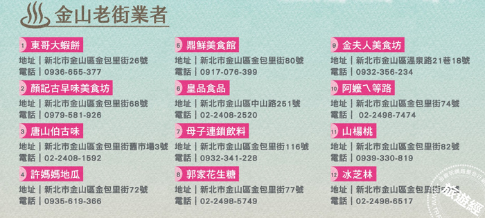 到了金山萬里,怎麼能錯過又名金包里老街的「金山老街」呢!金山老街是目前北海岸僅存的清代老街,已有三百多年的歷史,到這裡,絕對不能錯過的就是,廣安宮廟口的超人氣鴨肉攤,尤其體會一下那種「自助」的端菜文化,所形成的特殊的風景,到金山老街也不能錯過「新鮮水果手工冰淇淋」、手工製作的花生糖,當然也不要錯過買地瓜或芋頭,嫌回家麻煩料理,也可購買幾包「芋頭酥」或「地瓜酥」等也行。到了金山老街,也別忘了到了周邊,如:中山溫泉公園、魚路古道等地走訪。而想深度旅遊,可選擇參與「金采人文行導覽」,導覽一團上限40人 1.5小時3500元,也能來個地瓜圓DIY,一般民眾為350元。