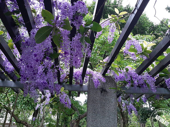 錫葉藤別名藍花藤、紫絨花、紙葉藤、許願藤,是馬鞭草科錫葉藤屬的藤本植物,莖長可達10公尺,具多數分枝,小枝細長。其葉片相當粗糙有如砂紙,可以用來磨擦錫器使其發亮,所以獲得「錫葉藤」稱號。花淡紫色或淡紫羅蘭色,花序長10~30公分,花開時常呈現一大片壯觀的景致,目前大安森林公園的錫葉藤正值開花時節,歡迎大家來公園遊玩時可以順道欣賞紫瀑。也提醒,錫葉藤花朵與花萼相交疊,真正的花朵位於中心較圓、較小、較紫為花朵,5裂形似花瓣為花萼,別認錯,若在地上撿到花萼,有時略為輕抛,會旋轉而飄落,也相當有趣!