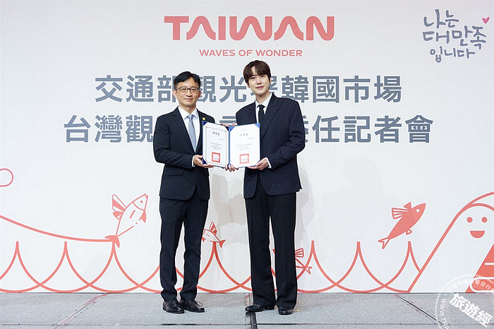 Super Junior 成員圭賢擔任韓國市場台灣觀光代言人,親手從交通部觀光署國際組黃易成組長手中接下台灣觀光代言人委任書