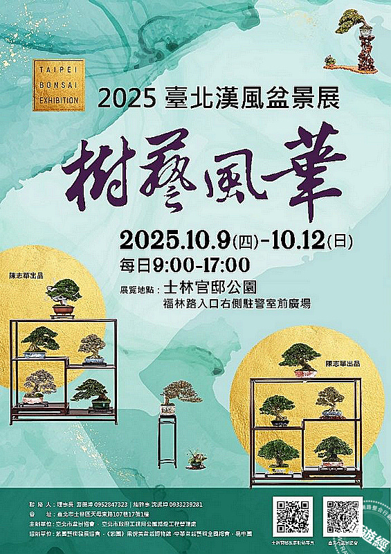 即接著即將迎來中秋雙十連假,喜歡植物或盆景的民眾,不妨計劃來趟充滿綠意與藝術的城市小旅行!「2025臺北漢風盆景展」將於10月9日至10月12日,在士林官邸公園盛大登場,活動為限期版,只有4天,請把握時機。此次展覽網羅全國名家精選之珍稀盆景,從數十年至百年以上的老樹到造型獨具的作品,展現東方園藝美學的極致韻味。這不只是一場靜態展覽,更是一場結合藝術、知識與親手體驗的園藝盛宴。期間特別推出六場「綠色教室」,邀請多位專業講師開設盆景DIY、松樹照護、盆栽美學、創意示範與基礎管理等多元課程,讓園藝知識生活化融入您的生活中,讓民眾從中獲得藝術啟發與身心療癒。