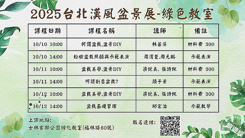 台北市政府公園處園藝所主任吳旻靜表示,今年的「綠色教室」課程結合理論與實作,不僅傳授專業技巧,也讓民眾透過動手操作、與講師面對面交流,在創作中感受專注與療癒,發現屬於自己的「方寸天地」。講師陣容星光熠熠,包括:台北市盆景協會講師張詩佩、協會榮譽理事長邱宏治、園藝福祉推廣協會講師林芸萍,以及多位技術顧問與評審專家,內容深入淺出、實用豐富。無論您是初學者還是愛好者,都能在互動教學中學會修枝、澆水、養護技巧,同時領略植物背後的自然哲學與生活美感,讓園藝知識真正走進日常。
