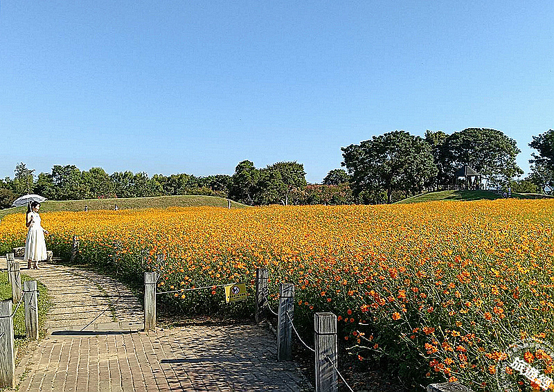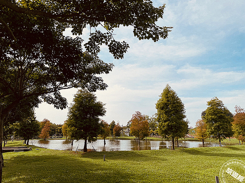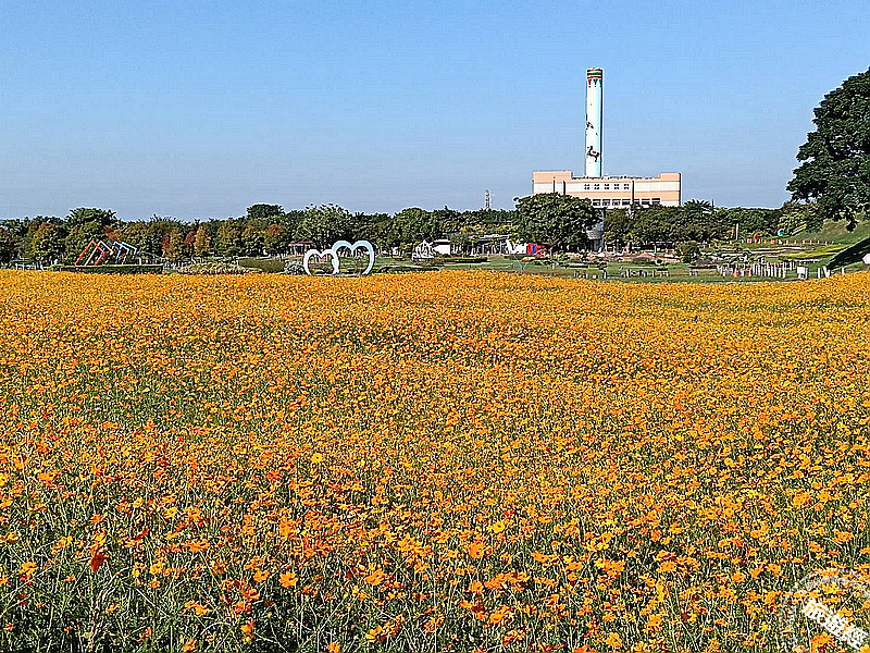 后里環保公園位於后里區堤防路北側,佔地達17公頃,園內設有林蔭步道、廣闊草坡、寵物專區與完善的休閒設施,是假日散步、野餐、放風箏與親子同遊的好去處,園內除黃波斯菊外,落羽松林也悄然轉色,金黃與橘紅交織如畫,構築出浪漫的「雙重秋色」。在同一場域中同時欣賞兩種截然不同卻同樣迷人的秋日風情,讓民眾彷彿置身童話畫境。