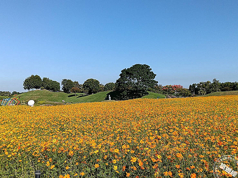 黃波斯菊花期落在十月上旬至中旬,盛開時滿園金黃燦爛,如同一片流動的花之海洋;搭配園內逐漸轉色的落羽松林,由綠轉黃再轉橘紅的層次變化,讓秋日景致更顯浪漫多樣,其美色,絕對是攝影愛好者與散步民眾的熱門取景地。許多民眾紛紛在網路上分享實景照與心得,驚呼「兩個星期前還只是綠葉嫩芽,現在居然全爆開了!」、「提前感受初秋的美!」,花海美景迅速在社群間口耳相傳,吸引遊客爭相前往朝聖。