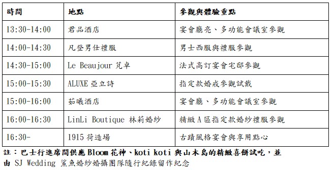 新人可體驗凡登的西服量身,打造新郎的最佳形象;鑑賞LinLi Boutique林莉高訂婚紗的精緻工藝;試戴ALUXE亞立詩鑽戒,見證永恆的愛情。此外,巴士上將提供 Bloom花神、koti koti 與山木島的精緻喜餅試吃,並有 SJ Wedding 鯊魚婚紗婚攝團隊隨行紀錄,讓新人從上車的那一刻起,就沉浸在幸福的氛圍中。