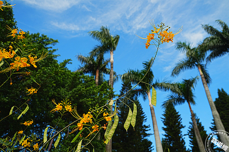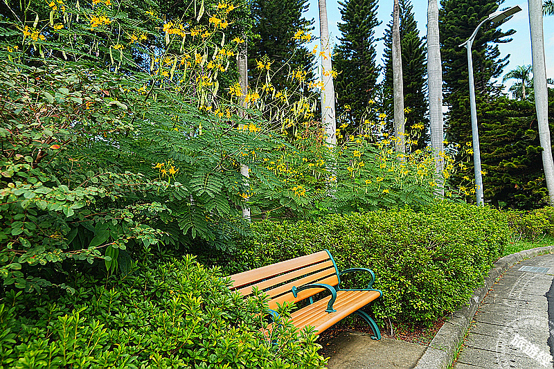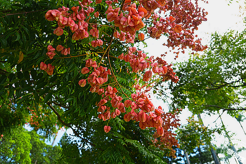 與花鐘相互幫襯,就是一旁的臺灣欒樹,滿枝紅果實閃閃發亮,像一串串小燈籠高掛樹梢,微風吹拂時搖曳生姿,美得有點秋意,讓人忍不住拿起手機拍照,沿著花鐘旁的步道散步,還會驚喜發現一整片黃蝴蝶花區正熱情綻放!金黃花海隨風搖曳,如同成群飛舞的蝴蝶,也替這片秋日風景畫添上明亮溫暖的一筆。