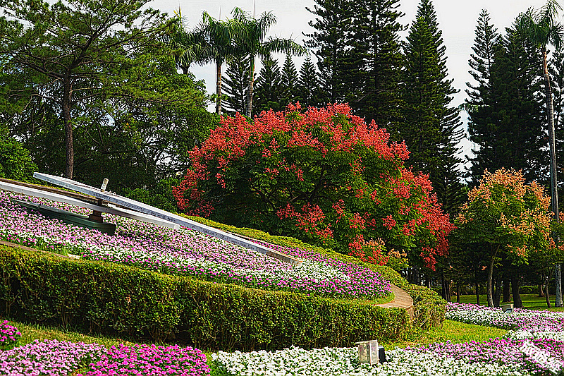 青年公園花鐘旁有錯落的轉紅的臺灣欒樹