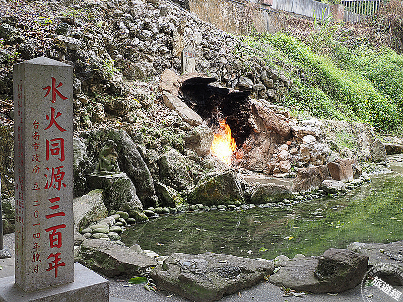 「水火同源」又名「水火洞」,是關子嶺地區最具代表性的自然奇景,由於火焰不斷從水中冒出的畫面,打破了水火不相容的定理!資料顯示,1701年「水火同源」被白河大仙寺的參徹禪師所發現,據他當時所言,當時火勢極為旺盛且集中一束,直至1964年白河大地震後,火焰分散自不同孔隙冒出,火勢變弱,但近期火焰有上升之勢。而水火同源在當地可是有傳說,由於關子嶺所在的枕頭山又稱麒麟山,水火同源的所在地就是麒麟頭吐出的火焰;另一種說法是遠古時期,火龍與水虎因意見不合而大打一架,結果兩敗俱傷,最後火龍化為火、水虎化為泉,變成了水火同源的景象,這裡也因為充滿想像力的神話與傳說,增添更多的神祕感與魅力。而在水火同源處,不妨欣賞一下雕塑大師楊英風將象徵著麒麟傳說的作品躍然於牆面上的創作,以及往另一個方向抬頭看,有一棵臘腸樹,碩大的結實,令人莞爾,但提醒未熟果有毒、成熟果會木質化變得很堅硬,在樹下時也要小心被砸傷!