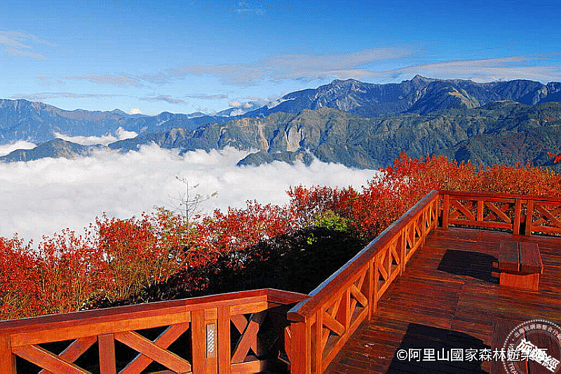 阿里山國家森林遊樂區是全台知名賞楓地,而其中的小笠原山觀景台能同時欣賞雲海與楓葉,建議遊客前往阿里山時,搭乘森林小火車賞五奇之餘,還能一次飽覽楓紅、雲海與鐵路景致。
