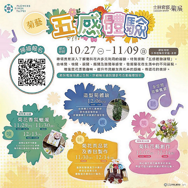 除此之外,為讓民眾更深入認識花藝,今年特別在活動期間的週末假日,規劃12場「菊藝五感體驗」系列課程。課程內容包含:「菊花香氛蠟燭」、「菊花茶品茗與香包手作」、「造型菊花體驗」、「菊科花藝創作」等主題,讓民眾不只賞花、聞香,更能親手創作、帶回一份花的記憶。課程即日起開放報名,報名至11月9日止,錄取者將以通知信方式參加。完成報名並經錄取通知者即可參加,親子家庭、大朋友小朋友都可報名參與。報名表單網址(https://docs.google.com/forms/d/e/1FAIpQLSfV1368ZHy0l6ox32kuDh0hcBRrNiHF2F8kHvGwiVncsedDEg/viewform)填寫,相關訊息請至「士林官邸旅客粉絲團」動態消息或至「花IN台北」官方網頁(https://flowersfestival.taipei/)查詢。