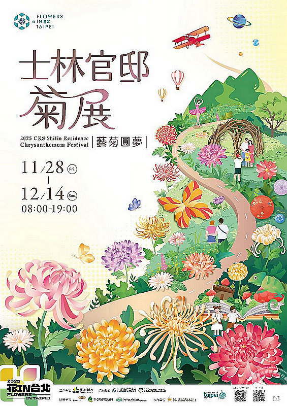 台北市政府園藝管理所吳旻靜主任補充,今年的主視覺海報暗藏展場路線巧思。從士林官邸花卉大道起步,遊客將依序穿越以童話故事為靈感的夢花園、充滿日式風情的和傘花徑、象徵蛻變的蝴蝶意象,再走入代表幸福的家園,最後搭乘熱氣球環遊世界,展開一段追尋心願的旅程。整條動線如同人生的時間軸,串連起築夢的每一個階段,沿途綻放的菊花宛如生命歷程的映照在成長的每個時刻,都能綻放屬於自己的光彩。