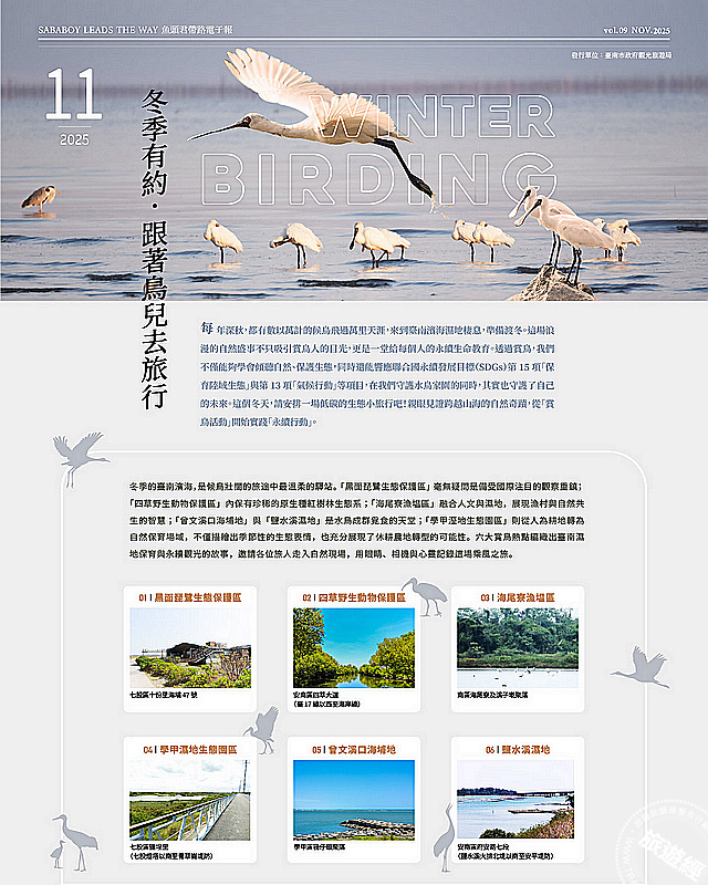 台南市觀旅局林國華局長表示,11月號的《魚頭君帶路》推出「冬季有約·跟著鳥兒去旅行」主題,介紹六處臺南濱海受黑面琵鷺青睞、作為渡冬棲息、可近距離觀賞黑面琵鷺的熱門地點,並提供六個大臺南濱海賞鳥亭給想要前往的旅人作行程規畫參考。