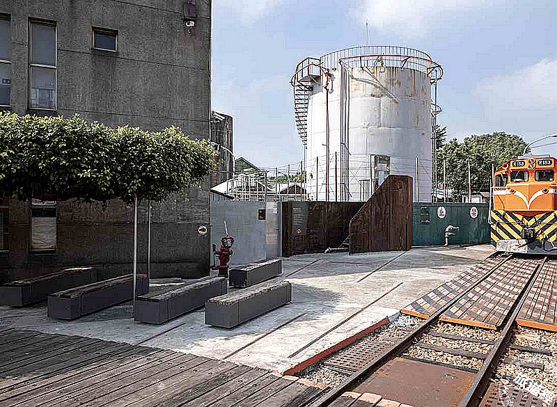 耐候鋼的現代俐落線條與老火車的厚重機械感形成強烈對比
