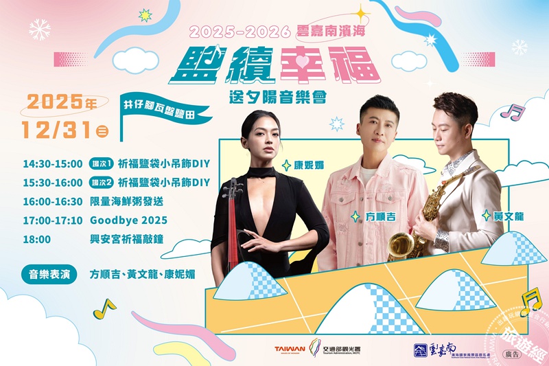 時值12月底,再過二三天即將告別2025年,2025年不管國際或國內發生許多大事,國際上包括:川普 2.0 與「關稅風暴」、日本迎來高市早苗首位女性首相、梵蒂岡則是因為教宗「方濟各」辭世,由首位美國籍教宗良十四世(Leo XIV)繼位等,而台灣方面,經歷政壇史上最大規模的立委罷免潮、東台灣受洪災影響,「鏟子超人」、2025 世界壯年運動會在雙北市舉辦等,而您自己呢?想好好與2025年告別嗎? 雲嘉南濱海國家風景區管理處12月31日在極具文化與自然景觀特色的「北門井仔腳瓦盤鹽田」,舉辦「2025–2026 雲嘉南濱海|鹽續幸福.送夕陽音樂會」,邀請大家在年末最溫柔的傍晚時刻,以音樂、美食、祈福與祝福,為 2025 畫下美好句點。
