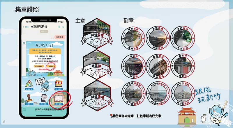 配合《跟風玩新竹》LINE 官方帳號上線,新竹市同步推出「風城印記」數位集章活動,自即日起至2026年3月31日止限定推出。旅客只要在指定景點掃描 QR code,集滿任一主章及任兩枚副章,即可兌換精美小禮物並取得抽獎資格。