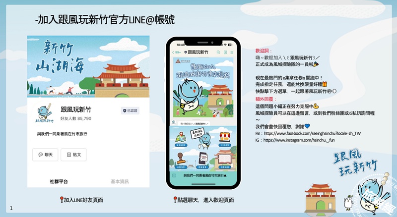 新竹市政府持續推動《跟風玩新竹》觀光旅遊品牌,以「山、湖、海」作為城市旅遊軸帶,正式推出 LINE 官方帳號《跟風玩新竹》,打造智慧且直覺的一站式旅遊入口。全新官方旅遊社群平台上線後,整合主題遊程、最新活動資訊與「風城印記」數位集章三大核心功能,讓旅客透過手機即可完成旅遊規劃與互動體驗。