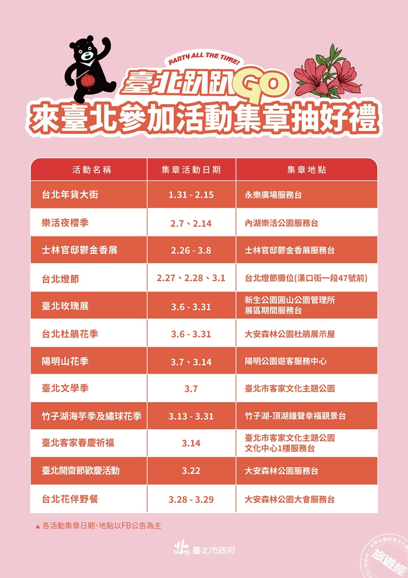 一年之計在於「春」,北台灣的民眾,平日在繁榮的都市為生計努力工作,不妨利用休閒假日,不用舟車勞頓,在台北就能Fun鬆玩,為此為民眾蒐羅臺北市1至3月共12場大型活動,涵蓋節慶感十足的台北年貨大街、台北燈節、臺北開齋節歡慶活動與客家春慶祈福,以及繽紛浪漫的陽明山花季、士林官邸鬱金香展、臺北玫瑰展、台北花伴野餐等「花IN台北」系列活動,花「漾」真的算得上多元豐富。另外,臺北市政府觀光傳播局為邀請民眾在台北或到台北玩,將推出「臺北趴趴GO」新春活動,凡參加指定活動就可累積集章抽獎,獎品包含:圓山半自由雙人2日遊、台北萬豪酒店下午茶餐券等好禮,若達年度集章門檻,還有機會抽中最大獎iPhone 17 pro。