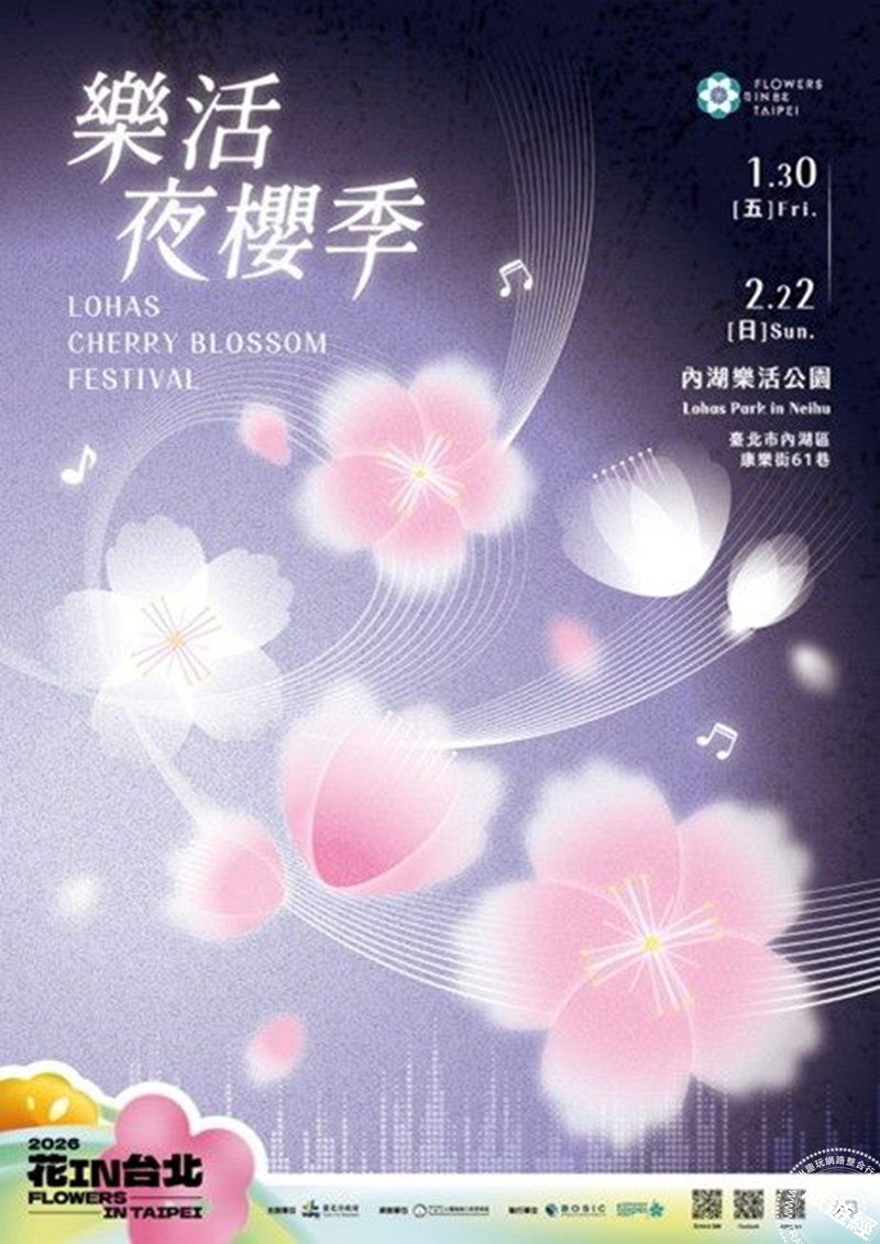 在這個「梅」好時刻,櫻花花訊也將緊跟而來,其中台北熱門的賞櫻景點──樂活公園,在櫻花綻放的時刻,於1月30日至2月22日,將舉辦2026樂活夜櫻季,讓遊客不僅在白日可以賞櫻花,在夜色降臨時,櫻花在燈光映照下,也展現不同的「櫻姿」。其首場活動於1月30日在內湖樂活公園正式展開,活動當晚,樂活公園在燈光點綴下成為夜間限定的賞櫻場域,邀請民眾在音樂、光影與花景交織的氛圍中,走入一場屬於春天的夜間視覺饗宴。