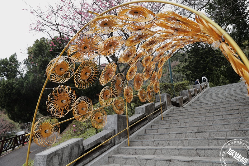 藝術作品,由藝術家以「在地工藝 × 自然景觀」為創作核心,讓作品不只是被觀看,而是成為民眾行走其間、可近距離感受的風景。其中,《花開向好》以「陽明山三種高度辨識的花卉記憶」為起點,取材自櫻花、茶花與向日葵,整體展示以「花田」的概念鋪展,依場域動線安排花株高度與密度,讓觀者在行走之間感受花勢起伏。另一件作品《迎光上行》則以金色質感作為整體色彩設定,金色不僅與竹材本身的米黃色調自然銜接,也呼應花季於農曆年後展開的節慶氛圍,使作品在空間中呈現溫潤、和諧且富有祝福意象的視覺效果,成為串聯花季動線的重要空間節點。